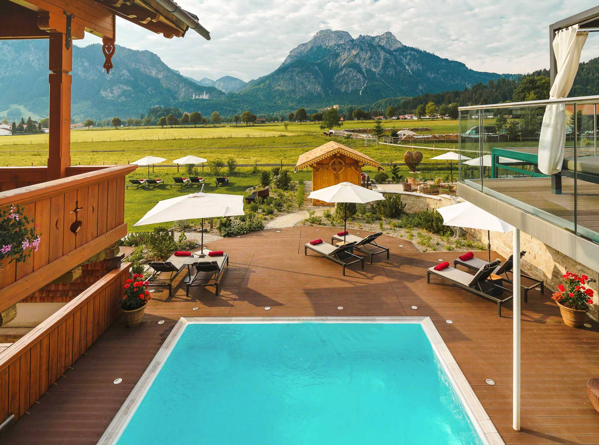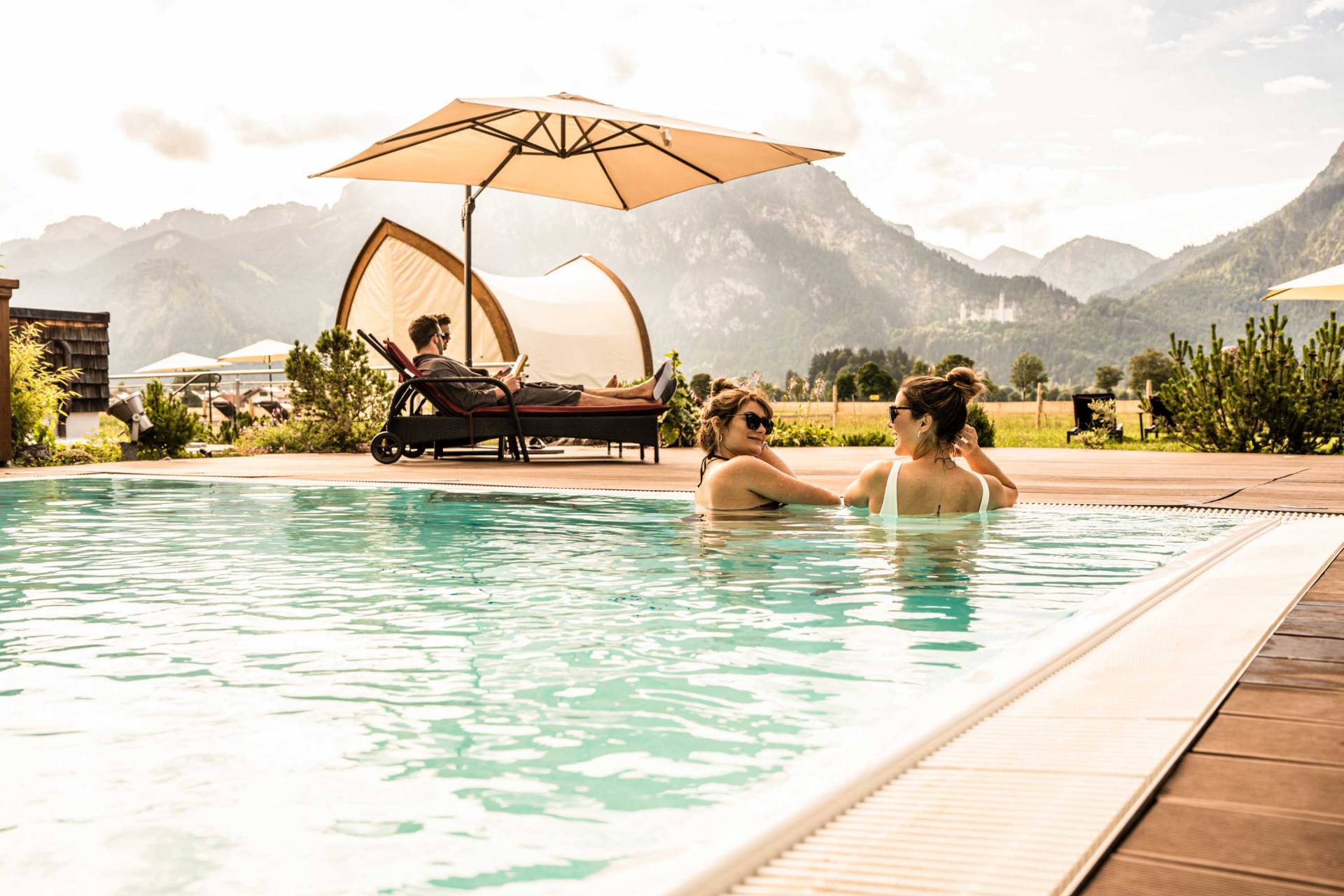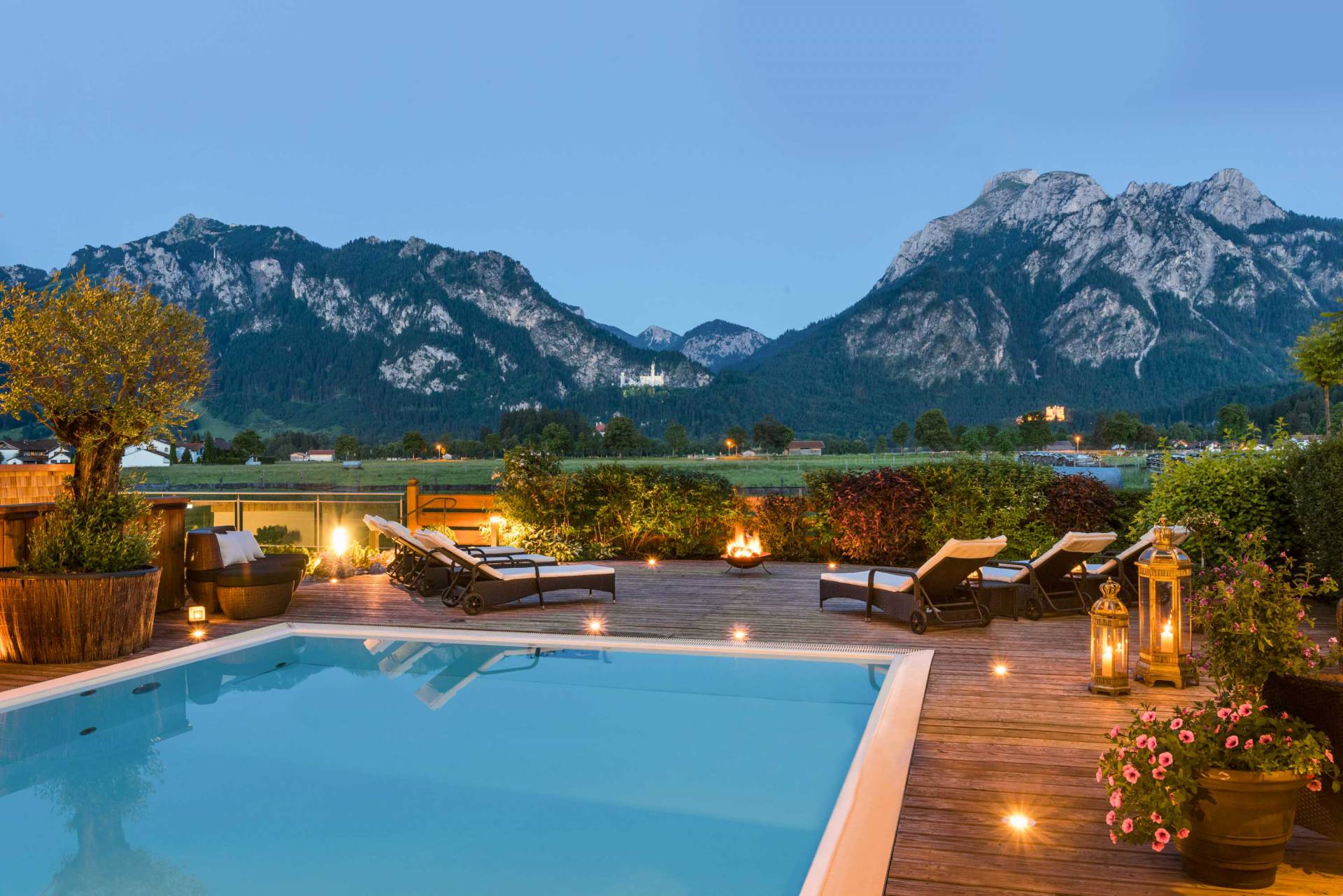 Warmer Außenpool mit Panorama auf Berge und Schloss Neuschwanstein