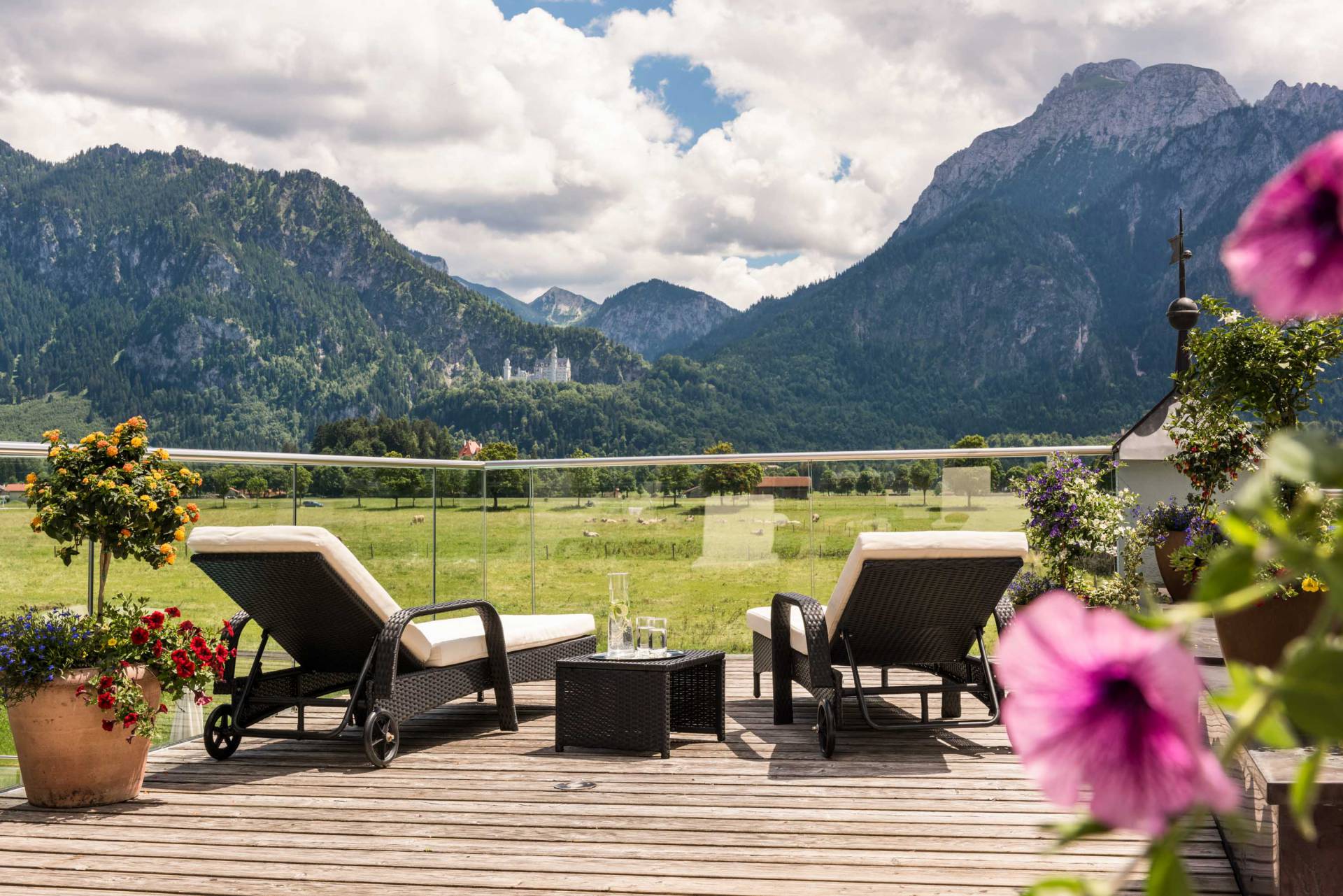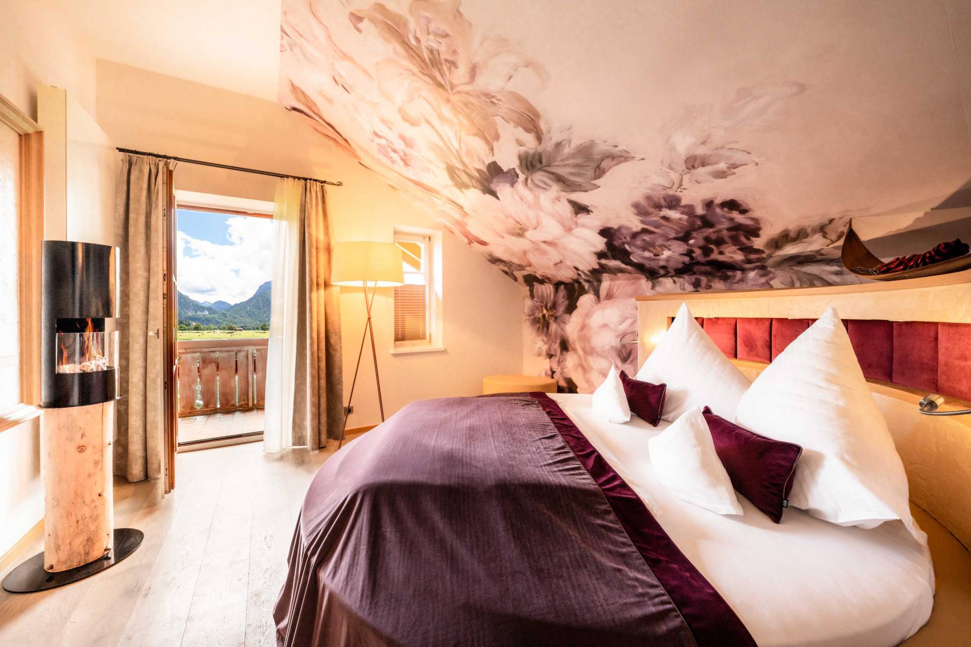 Hotelzimmer Alpenglühen im Hotel das Rübezahl Zimmer & Suiten Verwöhnpension Sonnenterrasse der Rohrkopfhütte am Tegeleberg Unsere Berghütten & Chalets im Allgäu Romantikurlaub mit Blick auf Schloss Neuschwanstein Inklusivleistungen Last-Minute & Angebote