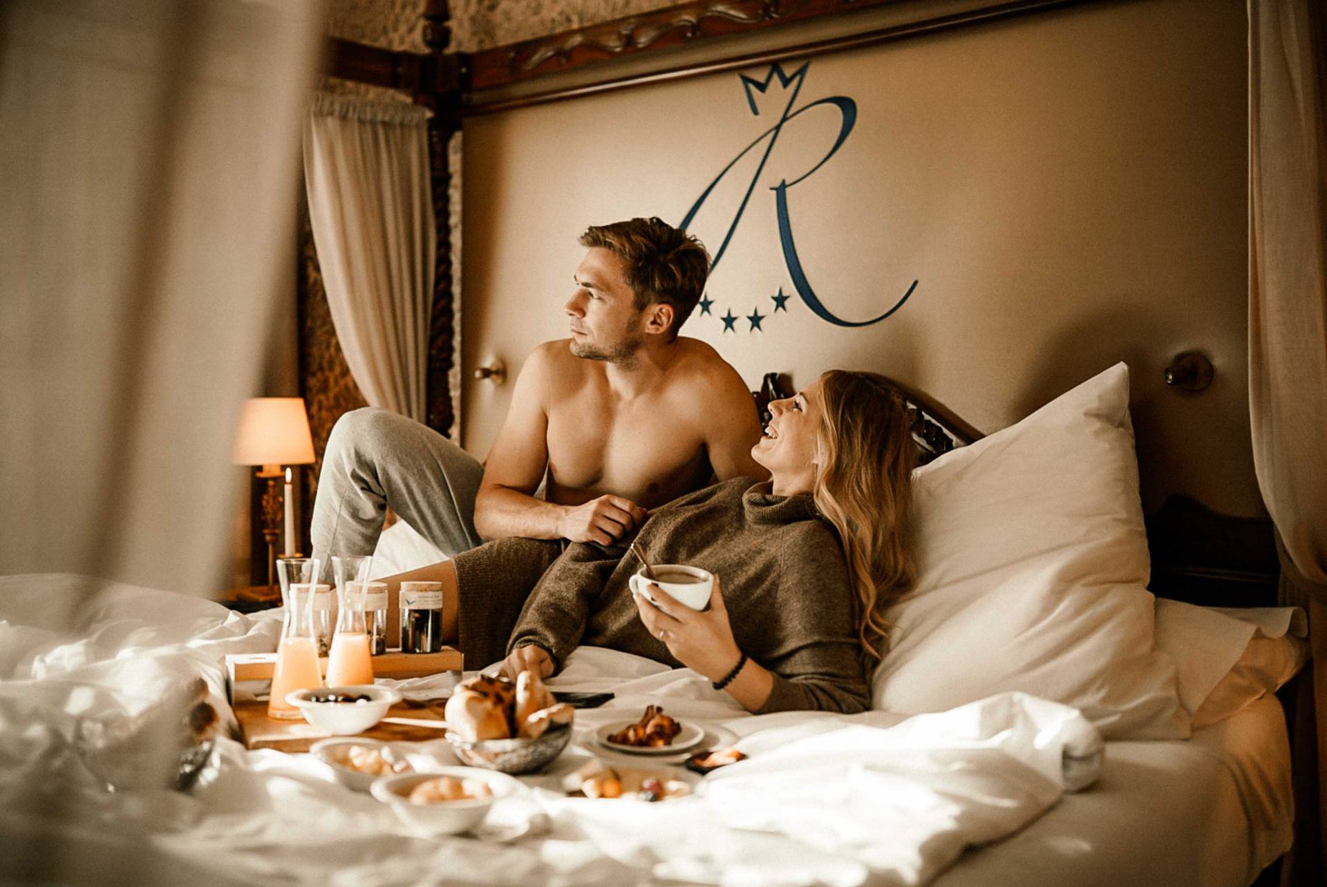 Pärchen genießt die Aussicht auf Schloss Neuschwanstein vom Hotelbett aus