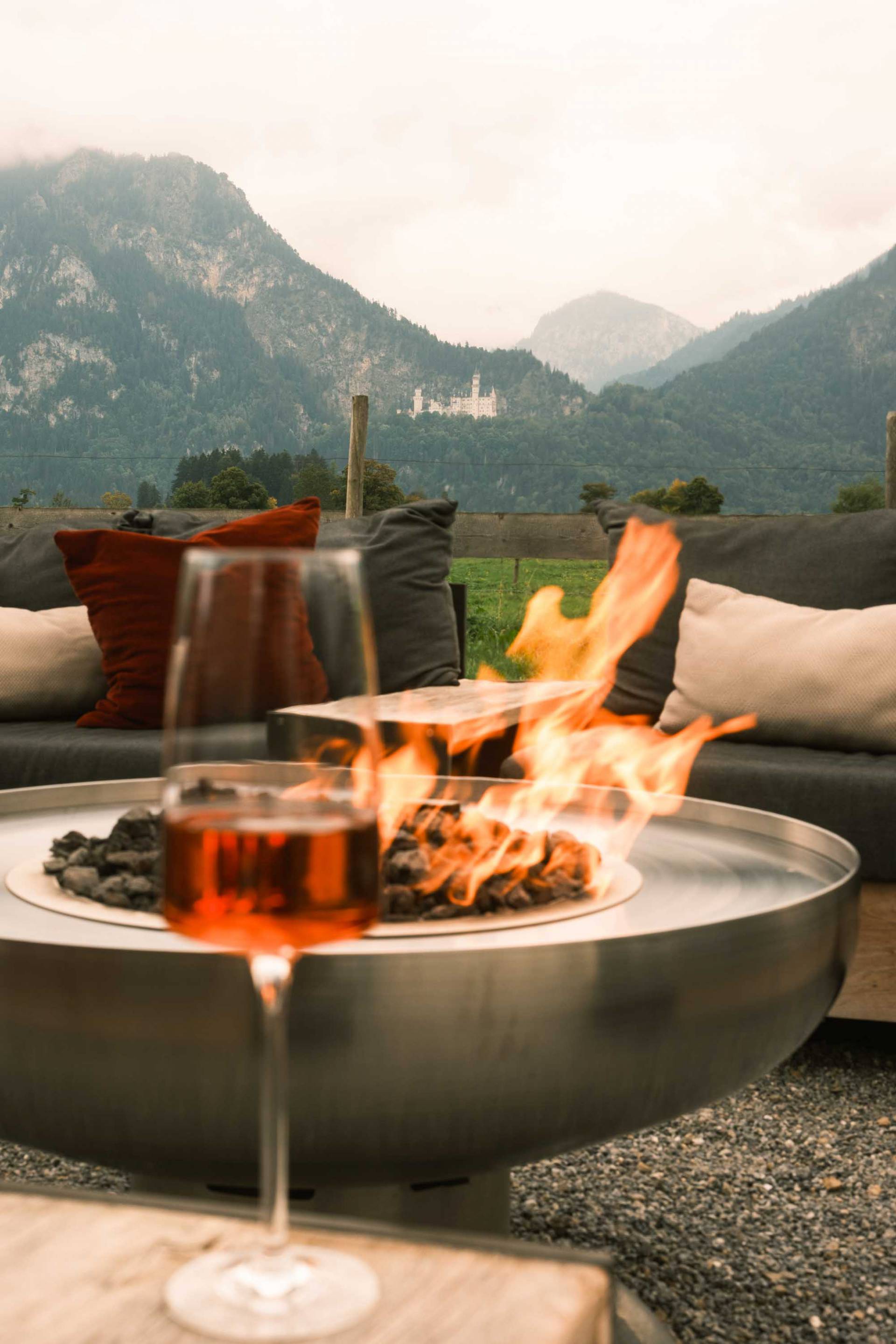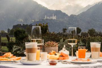 Wein und Snacks im Rübezahl Garten mit Blick auf Neuschwanstein