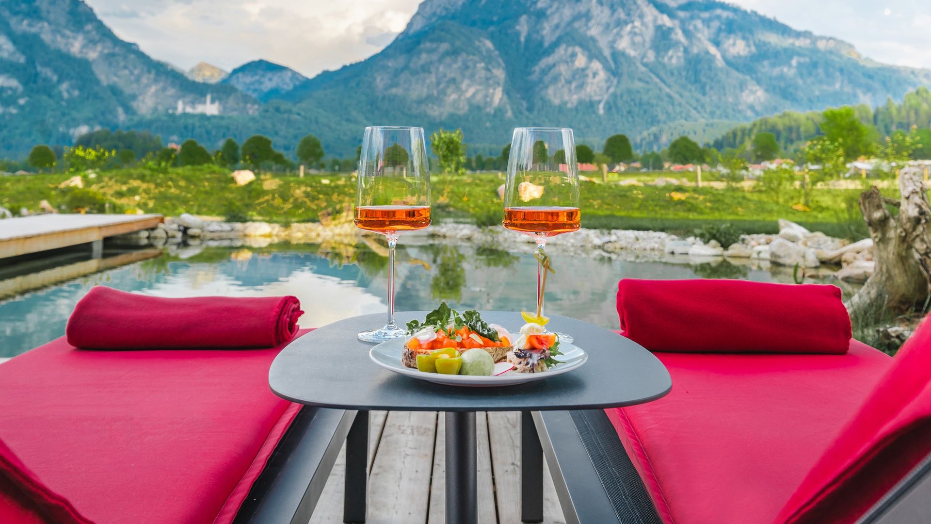 - 2.500 qm Wellnessgarten mit Natur-Schwimmteich, Feuerstelle, viele Rückzugsorte mit Panoramablick auf die Berge & Schlösser